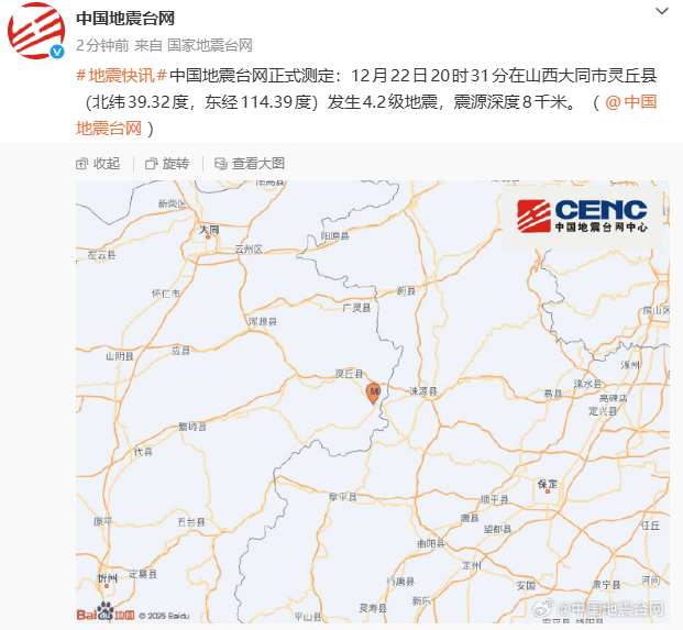 新京报讯 据中国地震台网官方监测,12月22日20时31分,山西省大同市灵丘县(北纬39.32度,东经114.39度)发生4.2级地震,震源深度8公里。据@中国地震台网消息,北京、石家庄有震感。编辑 李伊林子
