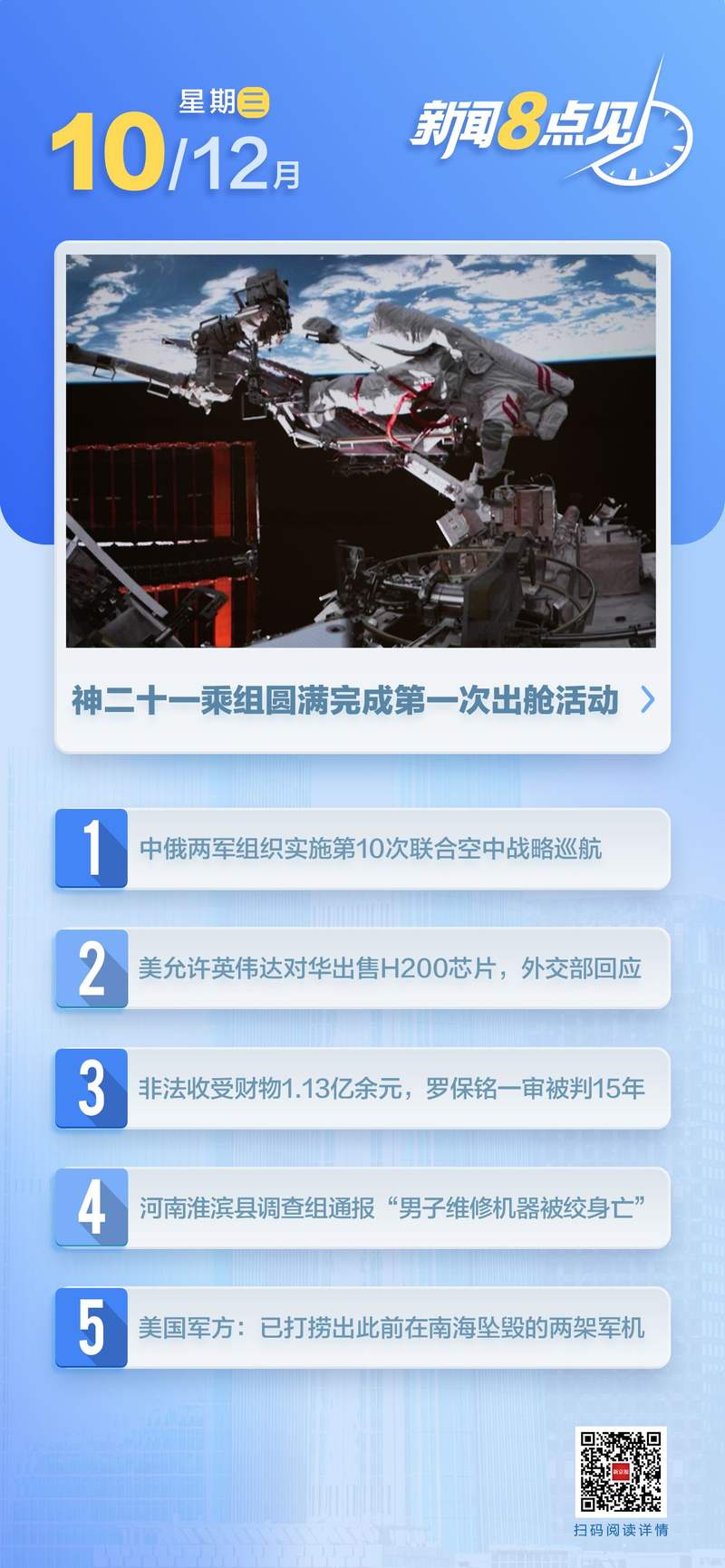 【时事新闻】中俄两军组织实施第十次联合战略空中巡逻。根据中俄两军年度合作计划,12月9日,双方在东海和西太平洋空域组织实施第十次联合战略空中巡逻。 。神舟二十一号航天员乘组九日顺利完成首次出舱活动,完成神舟二十号飞船返回舱舷窗检查、拍照等任务。据中国载人航天工程办公室介绍,12月9日18时45分,经过约8个小时的出舱活动,神舟二十一号航天员张璐、吴飞、张宏章正在一起工作。在空间站机械臂和地面科研人员的配合和支持下,他们在车外的第一个场景中充分发挥了积极作用。他们成功合作完成了神舟二十号飞船返回舱舷窗检查和拍照、空间站空间保护装置安装、多层控制适配器盖更换等工作。出舱航天员张璐、吴飞安全返回问天实验舱,出舱活动取得圆满成功。张鲁司令时隔两年半再次行走太空,航天员吴飞成为我国最年轻执行出舱任务的航天员。按照计划,神舟二十一号载人飞行任务期间,乘员和货运申请还将进行出舱活动,进行科学实验和技术测试,航天员乘员组将视情保护神舟二十号飞船受损的舷窗。 。近日,俄罗斯等周边国家纷纷发声,反对日本首相高市的不实言论。台湾。巴基斯坦、老挝、柬埔寨等国公开支持一个中国原则。外交部发言人郭家坤9日在例行会议上回答有关问题时表示,近代以来,日本军国主义借口所谓“现有危机局势”,对中国等亚洲国家发动侵略战争。他们所到之处都专注于邪恶,积累了惊人的血债。战争罪行无法消除,侵略历史无法逆转。日本右翼势力的任何诉求和挑衅言行都将死灰复燃,再次危害亚洲人民。各国有责任、有义务携起手来,共同挫败军国主义、法西斯主义复辟图谋,共同维护二战胜利成果,共同捍卫战后国际秩序,共同维护世界和平与稳定。 。佛部统治事务回应了。 12月9日,外交部发言人主持例行记者会。据报道,特朗普总统8日表示,美国将允许英伟达在中国销售已“获得客户认可”的H200人工智能芯片。对此,郭家琨表示,我们注意到有关报道,中方一贯支持中美互利共赢取得的成果。 (央视新闻)阅读全文>>>香港大埔火灾灾难造成160人死亡,120具尸体身份已确认。香港特区政府9日下午通报称,截至目前,大埔宏福苑火灾已造成160人死亡,相关身份识别和搜寻工作仍在进行中。香港警方表示,第二阶段的现场搜救和清理工作已经完成。警方表示,经过科学调查经鉴定,120具遇难者遗骸身份已得到确认,40具遗骸身份尚未确认,辨认和身份核实工作还将继续进行。此外,经对此前通报的31起失踪案进行进一步调查核实,目前仍有6人下落不明。 。香港医院管理局(医管局)发言人今日(9日)宣布,大埔火灾中受伤者仍在留医的情况持续改善。最后一名伤者被列为重伤者,目前情况稳定。仍在医院救治的24名伤者情况稳定。医护人员将继续努力救治所有伤者,祝愿他们早日康复。火灾中共有79名伤者在各公立医院接受治疗。此前有19名伤者伤势危重,另有55名伤者已康复出院。 。为了为严厉打击电视网络诈骗犯罪,切实维护人民群众财产安全和合法权益,公安部近日发布通缉令,公开逮捕缅北“四家”犯罪集团在逃人员。 。 2025年12月9日,上海市第一中级人民法院对第十三届全国人大华侨委员会副主任委员罗保明受贿罪予以公开处罚。被告人罗保明因受贿罪,判处有期徒刑十五年,并处罚金人民币500万元。罗保明犯罪所得的财产和利息将依法追缴,上缴国库。经审理查明,非法收受的财物总价值1.13亿余元。 。经最高人民法院批准,2025年12月9日上午,天津市第二中级人民法院遂依法处决罪犯田辉。最高人民法院经审查认定:2014年至2018年,被告人田辉利用担任华融(香港)国际控股有限公司业务发展第三部负责人、总经理、投资银行部董事总经理的职务便利,在项目收购、企业融资等方面为相关单位谋取利益,非法收受资产共计11.08元。 1亿多元。 。 12月8日,根据《公安部道路安全违法行为处理规定》等相关规定,北京市新增固定技术监控设备公布。 。公民持北京市社保卡可享受各项经济服务。 12月9日,新京报记者从北京市第三代社保工作进展情况新闻发布会上获悉。据悉,目前北京正在有序推进第三代社保卡换证工作。近800万人成功申请了第三代卡,申请次数近6000万次。定期更换即将发生。 。新京报记者了解到,12月9日,杀害河北邢台邻居一家五口的被告人范某某提出上诉。此前,他因过失杀人罪被判处死刑,并被剥夺政治权利终身。一审判决认定范某犯罪是有准备的,但范某认为与事实不符。他本无意杀人,却被冷达一怒之下杀人了。 。 12月9日,淮滨县联合调查组发布情况通报:2025年10月10日18时,该县鹿集乡张某帮助同村张某修理一台花生脱粒机。张某参与运送腰带,经抢救无效身亡。事件发生后,淮滨县立即成立了由公安、应急等部门组成的联合调查组。 10月17日,村民张某与死者张某的儿子达成赔偿协议。 12月4日,公安机关根据调查结果和《中华人民共和国刑事诉讼法》第一百一十二条的规定,决定对该事件不予起诉。 。 12月9日,中国田径短跑运动员苏炳添在微博长文宣布退役,正式结束21年的短跑生涯。他说,“是时候把接力棒交给下一代更年轻、更优秀的运动员了,让他们在未来以不同的方式走在赛道上。” 。 2026年澳网男女单正赛7名中国选手名单出炉unced,其中有7名中国选手。女双方面,郑沁