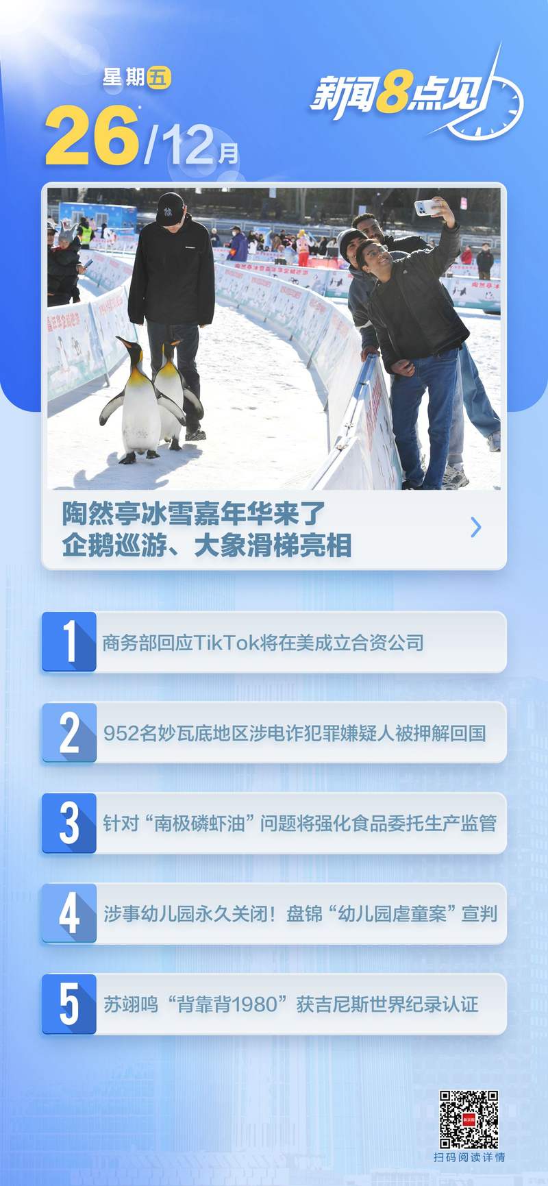 【时政】全国人大外事委员会新闻发言人就美国《2026财年国防授权法》涉华负面条款发表谈话。 12月25日,针对美国签署《2026财年国防授权法》成法,全国人大外事委员会新闻发言人徐东发表谈话。 (新华社)阅读全文>>>国防部:解放军不会停止争取“自由”促进统一的斗争。 12月25日下午,国防部举行例行记者会。国防部新闻发言人张晓刚大校表示,中国人民解放军不会停止争取“自由”、促进统一的斗争。你一吹“解放台湾”,压力就会加大,一直推到完全统一祖国的伟大事业就实现了。 (国防部网)阅读全文>>>商务部回应称TikTok将在美国设立合资公司。 12月25日,商务部新闻发言人何永前在回答有关TikTok与美国设立合资公司的问题时表示,中国政府希望双方企业能够达成符合中国法律法规、利益平衡的解决方案。 (央视新闻)阅读全文>>>国家再次提高部分退役军人等优待人员养老金补贴标准。退役军人事务部记者25日获悉,退役军人事务部、财政部近日发布通知明确,自2025年8月1日起,部分退役军人等优待人员养老金、生活补贴标准再次提高。通知要求各地结合实际认真贯彻落实,确保养老金、生活费按时足额发放。 (新华社)阅读全文>>>缅甸妙瓦底地区952名电力诈骗犯罪嫌疑人已被遣返中国。近日,公安部派出工作组会同缅甸、泰国执法机构,联合对缅甸苗瓦底地区赌博诈骗园区开展新一轮集中打击。 952名中国电力诈骗犯罪嫌疑人被遣返回国。 (公安部官方微博安全)阅读全文>>>我国刷新超导电磁浮推进世界纪录。近日,国防科技大学磁浮团队在磁浮实验中,成功将一吨重的试验车在两秒内加速到700公里/小时。本次测试速度打破了同类型平台的世界纪录,成为全球最快的超导电动磁浮试验速度。 (央视新闻)阅读全文>>>国家市场监管总局:针对“南极磷虾油”问题,将加强食品委托生产监管。国家市场监督管理总局25日回应称,“南极磷虾油”事件暴露出南极磷虾油生产加工中委托行为违规等问题。一些企业凭借企业品牌的影响力,只注重销售利润,不把关产品质量,甚至容忍信得过的企业生产、销售不合格产品。 (新华社)阅读全文>>>相关阅读同仁堂:责令李胜义辞去四川健康公司总经理职务,致3死1伤!上海市夜间人员碰撞事故调查报告浙江奥星地铁已发布。 2025年9月13日23时25分左右,绍兴轨道交通2号线一列返回现场检修的空车,在潭渡站至斗江站下行路段与4名保洁人员发生碰撞。经调查认定,绍兴市“9·13”轨道交通特大事故系因涉事企业未及时排查安全隐患和控制,违反员工安全操作规程,造成3人死亡、1人重伤的生产安全事故。 (新华社)阅读全文>>> 《移动电源安全技术规范》计划于明年一季度正式发布。工信部记者12月25日获悉,强制性国家标准《移动电源安全技术规范》拟正式发布d 于2026年第一季度实施,并在适当的过渡期后正式实施。 (新华社)阅读全文>>>【本地】北京新一轮客车配额申请评审结果已揭晓。 2025年10月8日24:00开始的旅客SAS配额申请,今日10:00公开分配。经分析,家庭普通客车配额申请有效代码合计624185个,个人普通客车配额申请有效代码合计2624575个,普通客车配额申请单位有效代码合计52455个。审核结果(含考核)已于2025年12月25日公布。(北京市机动车辆监督管理办公室)阅读全文>>>陶然亭冰雪嘉年华今日正式运营,企鹅巡游、大象滑梯亮相。 12月25日,游客在陶然亭与企鹅合影。冰雪嘉年华。新京报记者 薛军 陶然亭公园记者获悉,陶然亭冰雪嘉年华将于今日开始试运营,将于本周六正式开幕。 3.8万平方米的大雪场不仅有企鹅巡游、雪地飞碟、冰滑梯等时尚游乐项目,更有再现北京人童年时光的大象滑梯复制品。 (新京报)阅读全文>>>【社会】涉事幼儿园永久停课!盘锦“幼儿园虐童案”刑罚:被告人获刑两年 辽宁省盘锦市大洼区人民法院25日公开宣判被告人张某虐待保育员案一审判决。被告人张某因虐待护理人员被判处有期徒刑两年,并禁止在未成年人附近工作。也从相关partido了解鹏程幼儿园已被永久停课,幼儿园其他责任人已受到相应处罚。 (新华社)阅读全文>>>郑州中原保时捷中心连夜关店,保时捷中国致歉:正在接受警方调查。对于郑州中原保时捷中心连夜关店并疑似“跑路”的情况,保时捷中国于12月25日致歉,并回应称,对保时捷授权经销商郑州中原保时捷中心的异常经营深表关注。目前正在与警方及相关部门核实现场情况。 (新京报)阅读全文>>>【财经】离岸人民币兑美元自2024年9月以来首次升至7.0关口。12月25日,离岸人民币兑美元自2024年9月以来首次升至7.0关口;在岸人民币涨幅最高7.0061。 (人民财经讯)【体育】2026年中国足协超级杯将在南京举行。中国足协25日宣布,2026年超级杯将在南京奥体中心举行,上海海港队对阵北京国安队。 (新华社)阅读全文>>>王非、孙军等著名球员入选中国篮球名人堂。中国篮协25日在北京举行“中国篮球媒体日暨2025年中国篮球名人堂名单公布仪式”。该名单在活动中正式公布。男篮明星王非、孙军等9人被选为一组。 (新华社)阅读全文>>>苏一鸣的“背靠背1980”动作正式获得吉尼斯世界纪录认证。近日,苏一鸣于今年10月7日结束的《背靠背1980》行动正式获得认证吉尼斯世界纪录确认他创造了“单板滑雪连续滑行最多 1980 度转弯”的吉尼斯世界纪录。此前,他还保持着“1980年第一个完